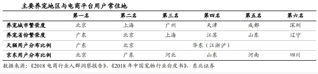 第三、中国养宠主力与电商用户群体匹配,将电商用户画像与宠物主进行匹配,我们发现二者有着相当显著的一致性;根据宠物行业白皮书统计显示,国内养宠的主要人群集中在80、90后,占比高达80%左右;网购用户中 80 后和 90 后占到 75%以上,大多具有相对稳定的工作岗位。品牌电商用户中约 65%有超过3000元的月收入,能够负担起养育宠物猫或狗的基本支出。此外,养宠人群多集中在较繁荣城市和地区,而电商平台用户居住地也多集中在这些地区。这为宠物电商渠道的发展提供了良好的环境。年轻一代乐于通过电商渠道为宠物进行消费,这构成了宠物电商发展的主要动力。