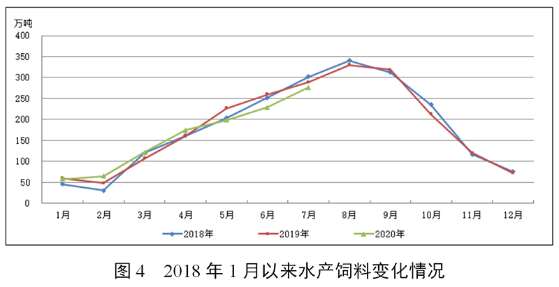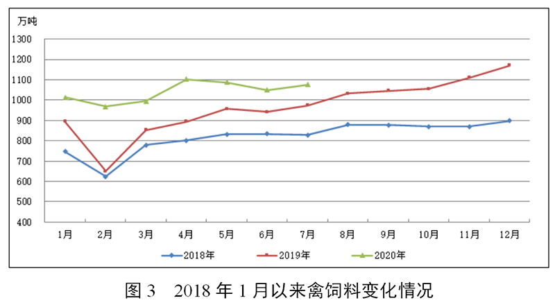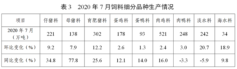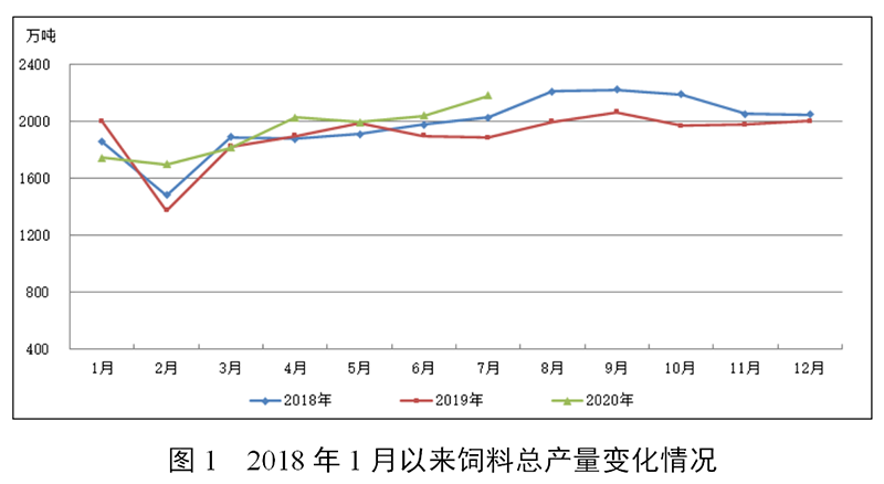 据截至8月6日已填报企业测算,2020年7月,饲料总产量2190万吨,环比增长7.3%,同比增长16.0%。从趋势上看,今年3月、4月和6月、7月饲料总产量环比增长,7月环比较上月扩大5.1个百分点;2月以后,除3月份同比小幅下降外,其余各月份产量均比上年同期有所增长,7月饲料产量达近三年的高位水平,高于2017年以来的月度平均产量。