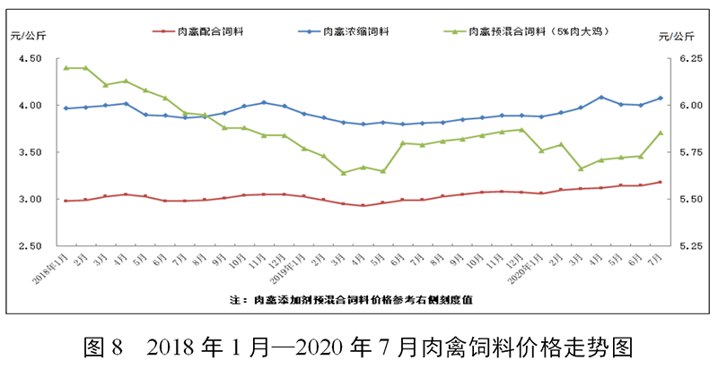 7月份,因玉米价格持续上涨,带动麸皮等能量饲料原料价格上涨,配合饲料价格普遍上涨,主要饲料品种价格比上年同期上涨5.3—6.0个百分点。豆粕价格偏强震荡,带动蛋白饲料原料价格不同程度上涨,除蛋禽浓缩料同比小幅下降外,其他浓缩饲料价格比上年同期上涨0.5—3.4个百分点。预混合饲料同比以小幅下降为主。