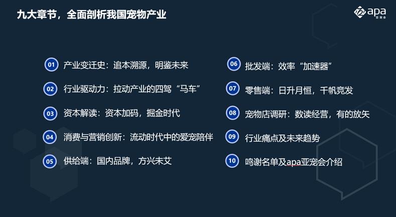 亚宠研究院表示:“由apa亚宠会出品的蓝皮书,运用严谨、科学的研究方法,通过案头调研、深度访谈、在线问卷调查和定性定量相结合的分析方法,对除了宠物医疗版块之外的全产业链做了详实、详尽的分析研究。旨在为宠物业界人士及对有兴趣进入宠物行业的企业提供参考。”