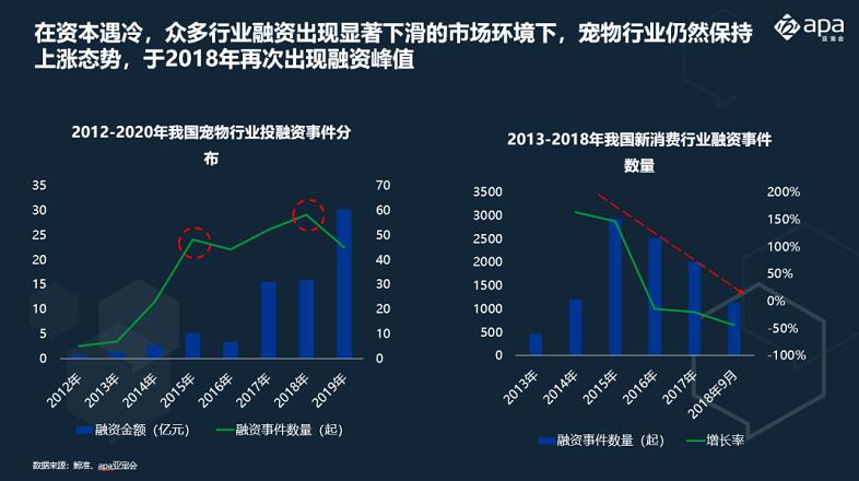 # 在资本遇冷,众多行业融资出现显著下滑的市场环境下,宠物行业仍然保持上涨态势,于2018年再次出现融资峰值;具有高复购率、高客单价、高质量体验特征的赛道资本关注度高。
