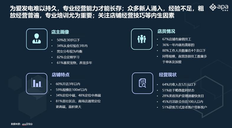 首期蓝皮书的亮点之一,是对全国宠物店采用线上问卷调研的方式,对宠物店的经营能力及影响因子做量化的分析,结合线下深度访谈及数学模型,点面结合,剖析宠物店侧写并总结归纳盈利能力偏好指数。