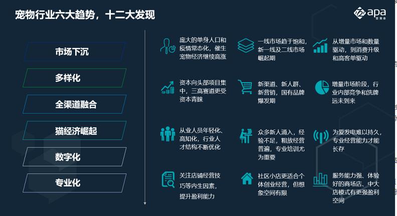 最后,在对我国宠物行业进行了全面分析和论证后,蓝皮书得出了宠物行业六大趋势和十二大发现。