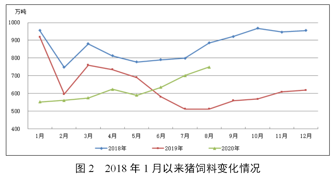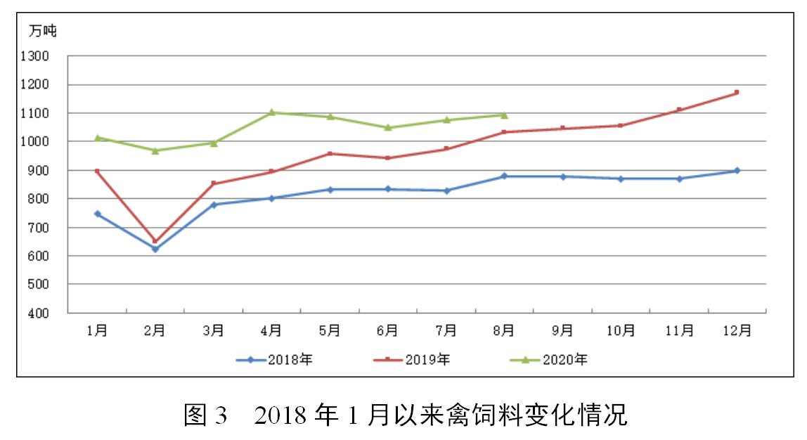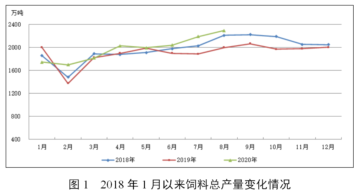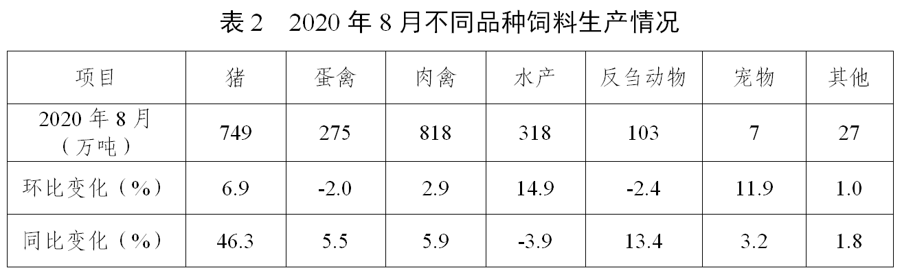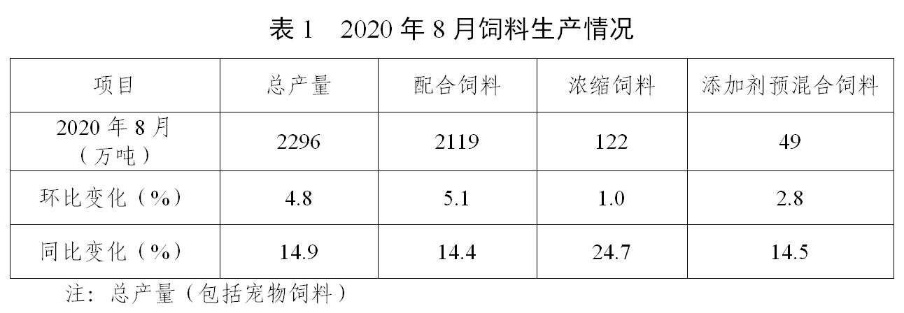 据截至9月6日已填报企业测算,2020年8月,饲料总产量2296万吨,环比增长4.8%,同比增长14.9%,为2017年10月以来的最高单月产量。从品种看,8月猪饲料产量749万吨,环比增长6.9%,同比增长46.3%,连续3个月同比增长。其中,母猪饲料产量同比大幅增长93.4%,连续7个月同比增长。蛋禽饲料产量275万吨,同比增长5.5%,环比下降2.0%。肉禽饲料产量818万吨,同比增长5.9%,环比增长2.9%。水产饲料产量318万吨,同比下降3.9%,环比增长14.9%。反刍动物饲料产量103万吨,同比增长13.4%,环比下降2.4%。