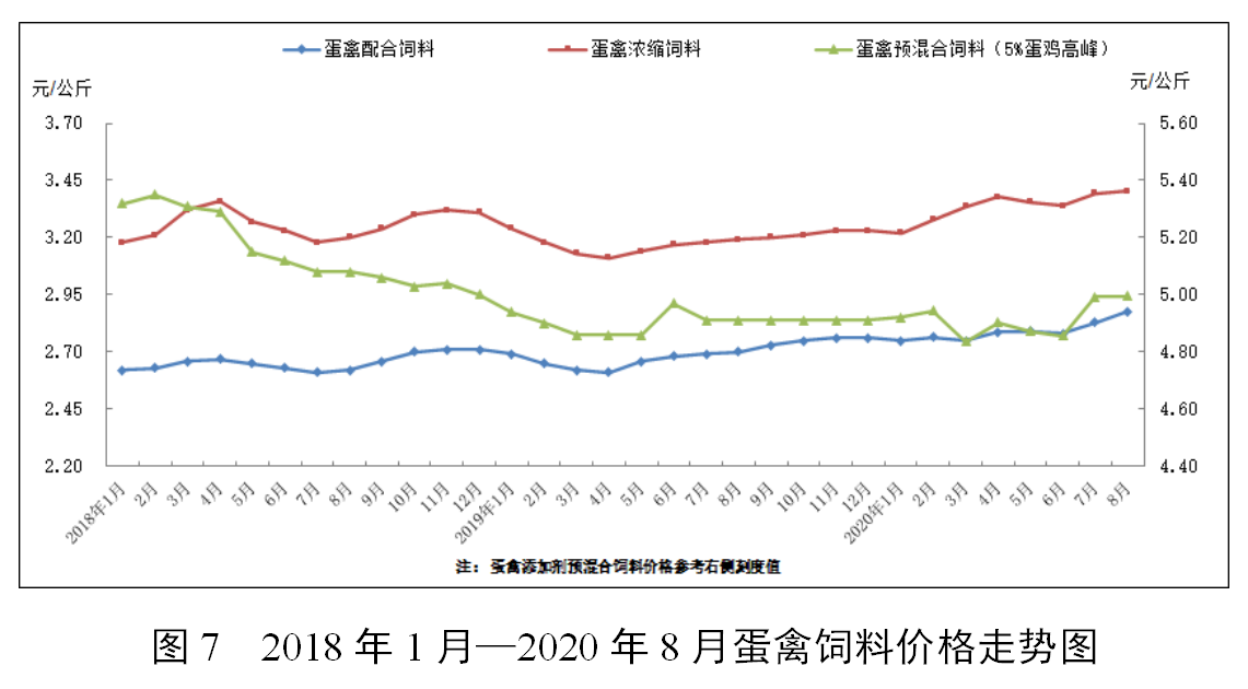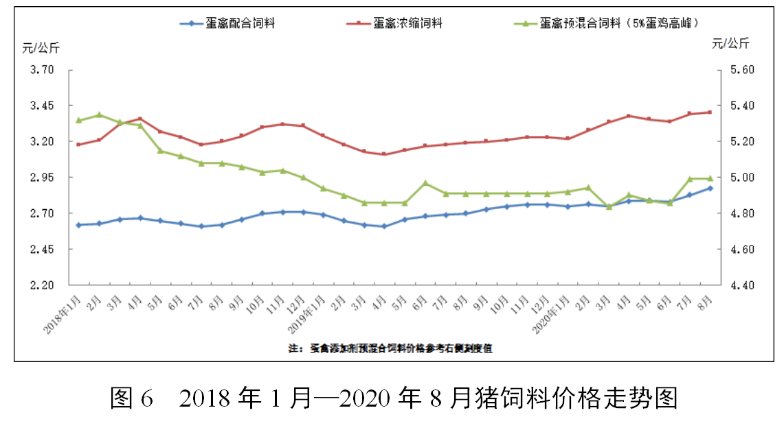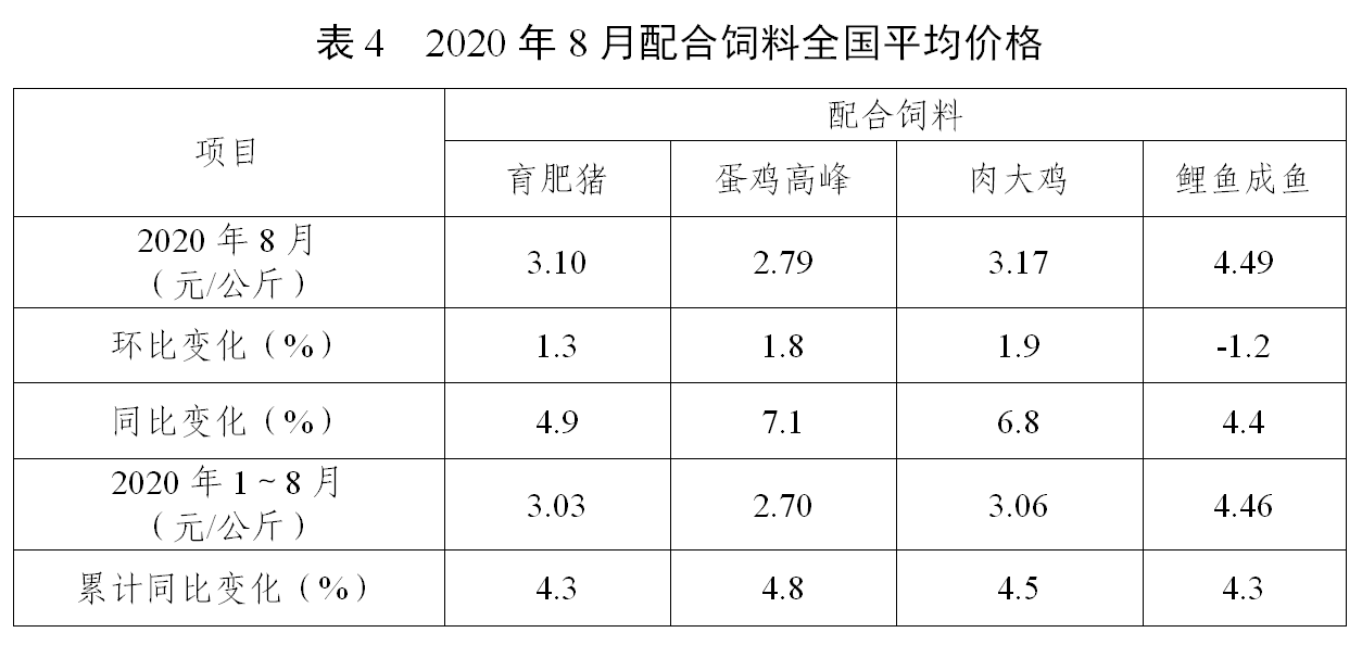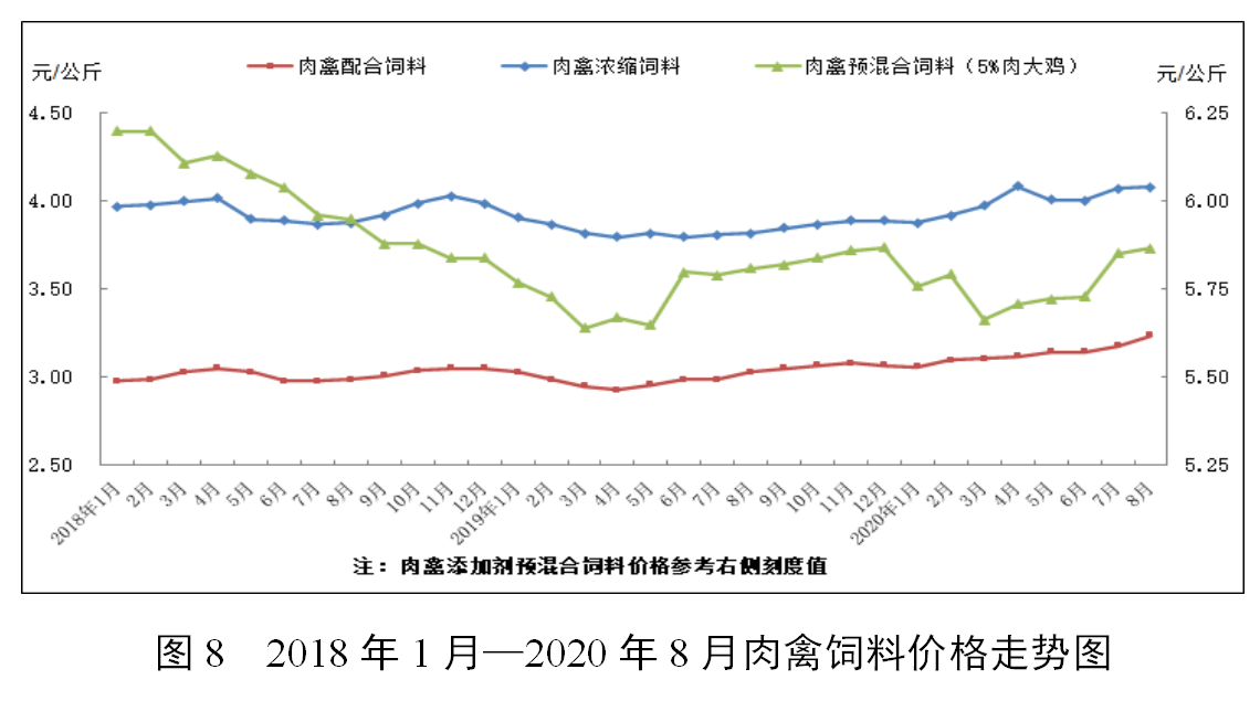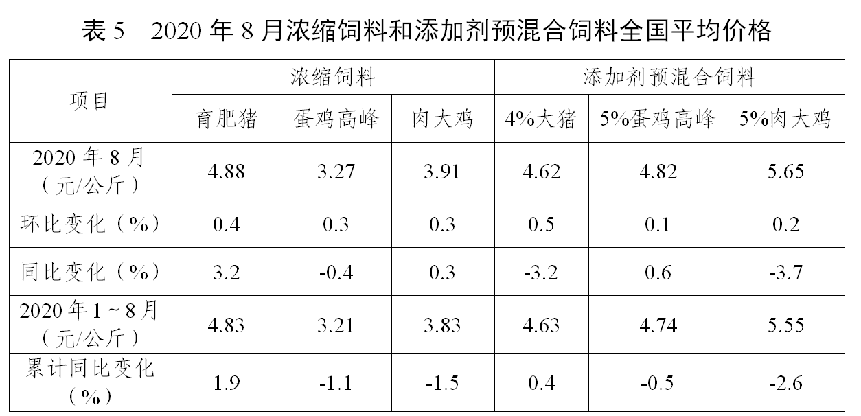 因玉米、麸皮等能量饲料原料价格高位,8月配合饲料价格普遍上涨,主要饲料品种价格比上年同期上涨4.4—7.1个百分点。豆粕价格保持相对平稳,除育肥猪浓缩料因需求增加拉动价格同比上涨3.2%外,其他浓缩饲料价格基本稳定。大猪和肉大鸡预混合饲料价格同比下降。