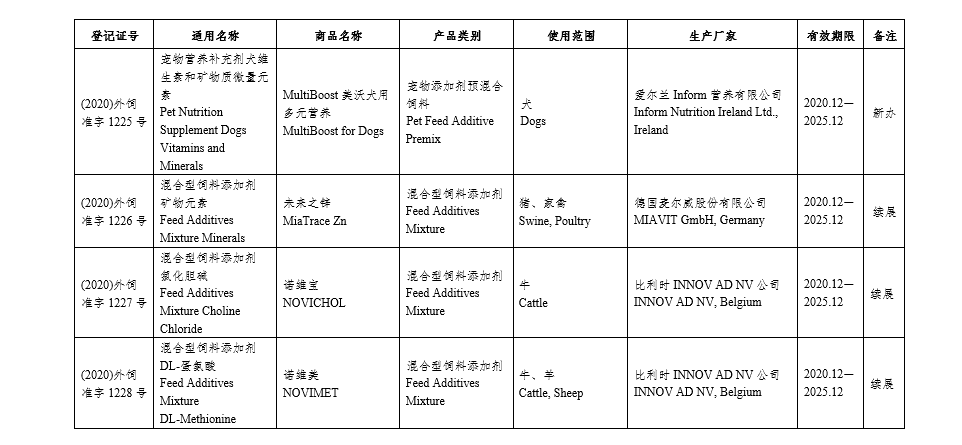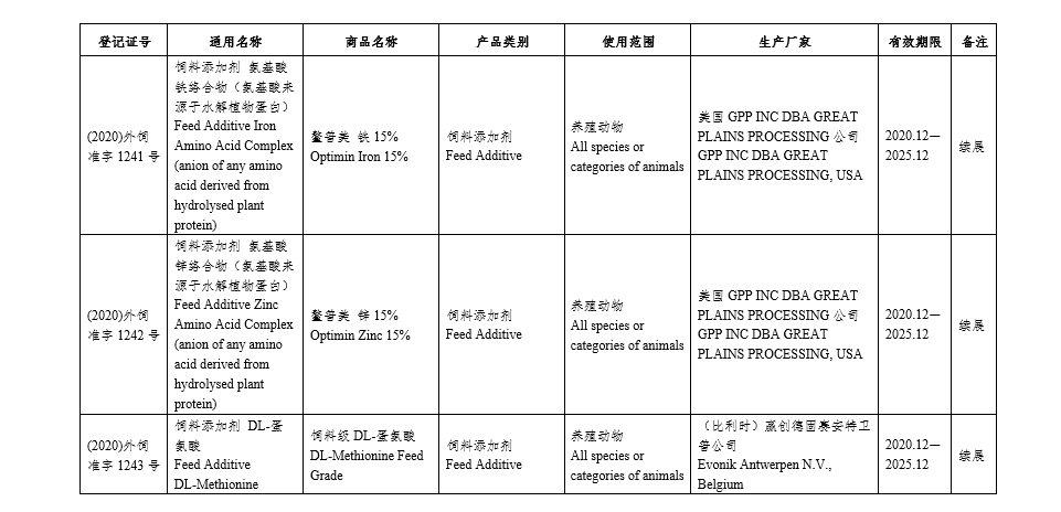 批准饲料级DL-蛋氨酸(DL-Methionine Feed Grade)等12个产品申请企业名称和生产厂家名称变更,利补舒(Liposorb)中外文商品名称变更,泰富展®(PolyEnrich®)等2个产品申请企业名称变更(见附件2)。