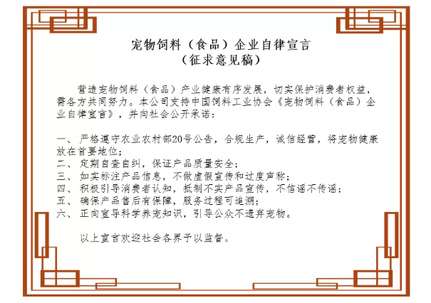 2021年4月27日,由中国饲料工业协会主办、北京市饲料工业协会宠物食品与健康分会承办的“中国宠物饲料(食品)行业发展座谈会”今日在京召开。大会宣布,中国饲料工业协会宠物饲料(食品)分会将开展全国性的宠物饲料(食品)行业摸底调研,形成首个《中国宠物饲料(食品)产业经济发展报告》,助推宠物饲料产业发展。大会还就消费者信任危机、法规标准完善、企业自律等议题达成共识,并讨论通过了《宠物饲料(食品)企业自律宣言(征求意见稿)》。