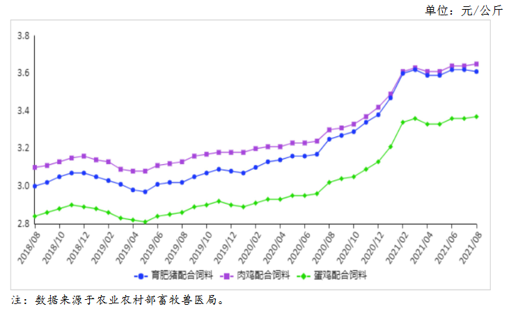 8月份育肥猪、肉鸡、蛋鸡配合饲料月均价分别为每公斤3.61元、3.65元、3.37元,环比分别跌0.3%、涨0.3%、涨0.3%,同比分别涨11.1%、10.6%、11.6%。