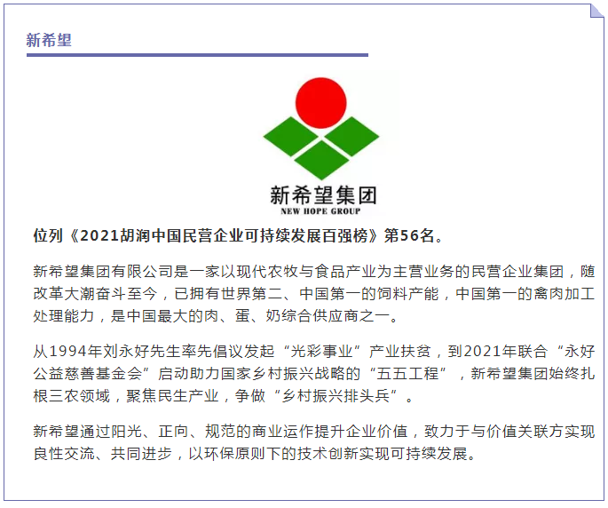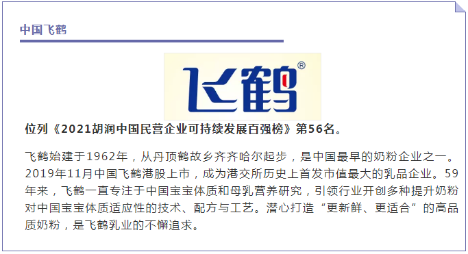 1月10日,胡润研究院发布《2021胡润中国民营企业可持续发展百强榜》,列出了100家最符合联合国17个可持续发展目标的中国民营企业。这里的“中国民营企业”是指总部在中国内地的非公有制企业,有4家乳业荣登该榜单,分别是伊利、中国飞鹤、温氏食品、新希望。
