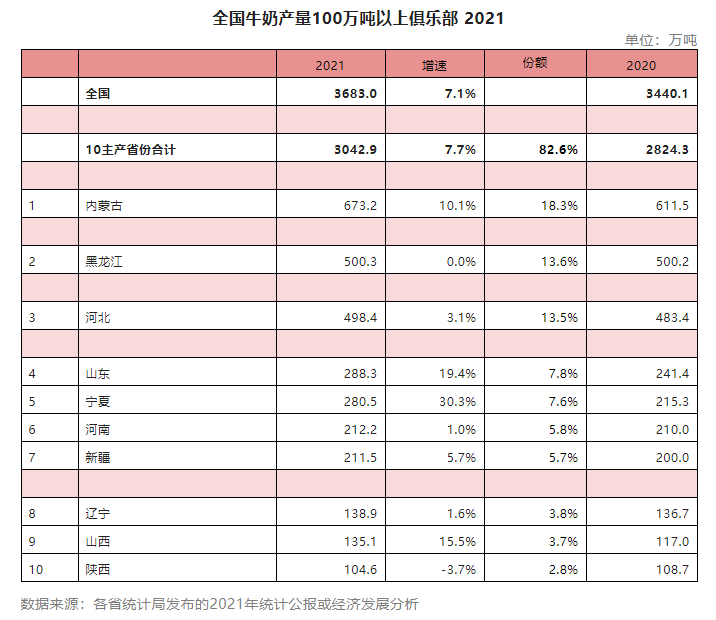 国家统计局数据显示,2021我国牛奶总产量(本篇分析只比较生鲜牛乳)3683万吨,荷斯坦根据各省统计公报,超过100万吨的省份有10个,内蒙古、黑龙江、河北、山东、宁夏、河南、新疆、辽宁、山西、陕西,合计3042.9万吨,占82.6%。与上年相比,2021年Top10省份位次没有发生变化。