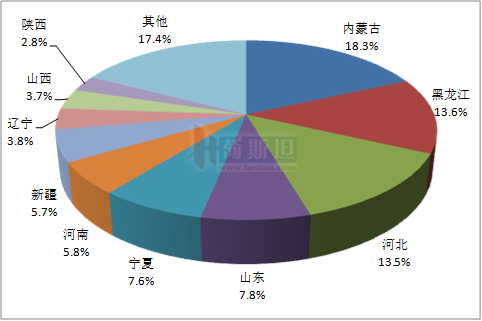 超过200万吨的有山东、宁夏、河南、新疆四省区,超过100万吨的有辽宁、山西、陕西三省。