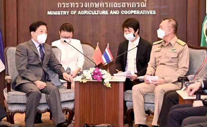 图片中国驻泰大使韩志强(左)与泰国农合社部长察霖猜(右)