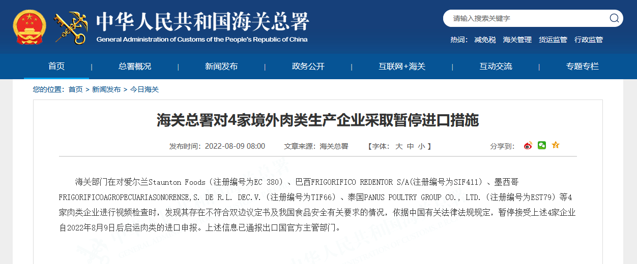 海关部门在对爱尔兰Staunton Foods(注册编号为EC 380)、巴西FRIGORIFICO REDENTOR S/A(注册编号为SIF411)、墨西哥FRIGORIFICOAGROPECUARIASONORENSE,S. DE R.L. DEC.V.(注册编号为TIF66)、泰国PANUS POULTRY GROUP CO., LTD.(注册编号为EST79)等4家肉类企业进行视频检查时,发现其存在不符合双边议定书及我国食品安全有关要求的情况,依据中国有关法律法规规定,暂停接受上述4家企业自2022年8月9日后启运肉类的进口申报。