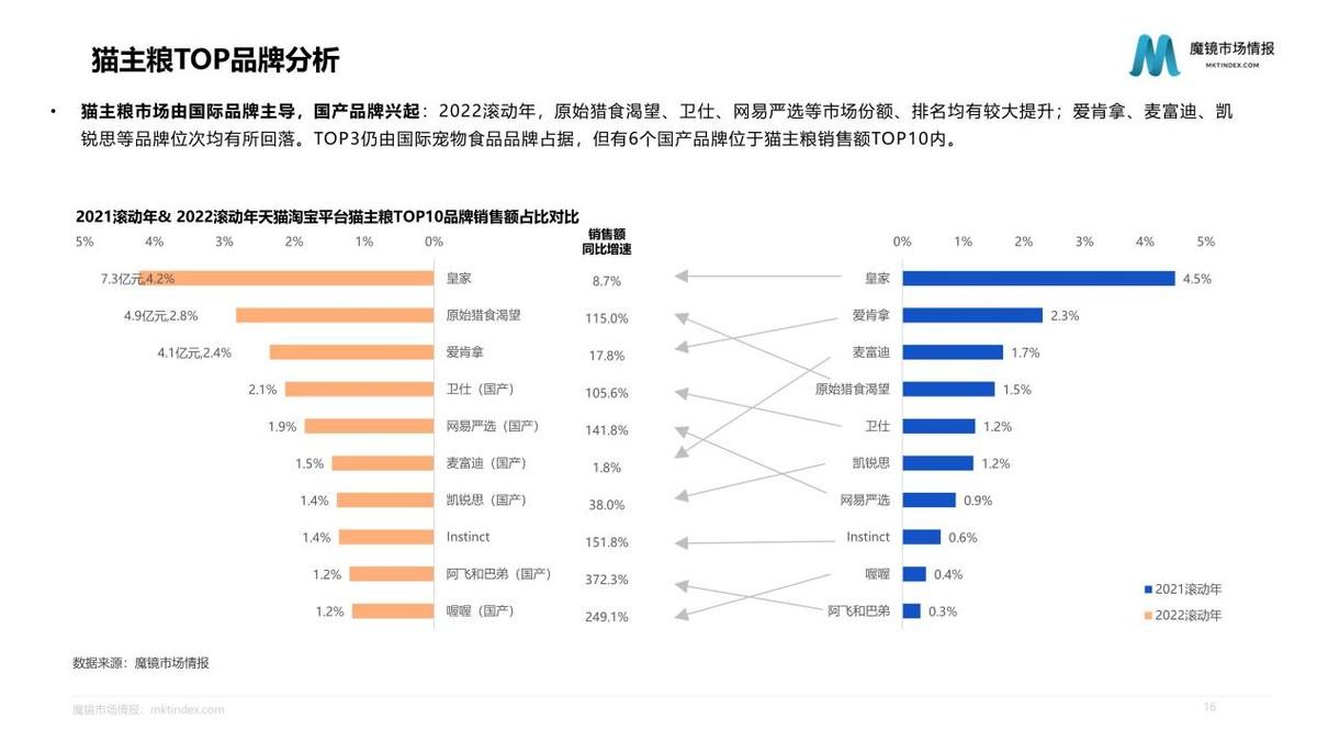 深入分析市场产品发现,无谷、鸡肉、天然鲜肉等成分概念占据主流,生骨肉、双拼等成分概念增速明显;冻干工艺占据主流,湿粮、低温烘焙等概念增速明显;增肥发腮、营养功效概念占据主导;成猫、幼猫是最主流的区分类型,专用概念增速明显。2022滚动年,原始猎食渴望、卫仕等市场份额、排名均有较大提升;TOP3仍由国际宠物食品品牌占据,但有6个国产品牌位于猫主粮销售额TOP10内。