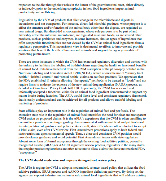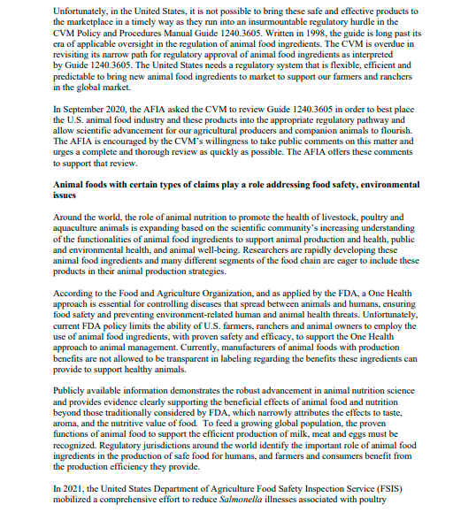 根据AFIA的说法,CVM有权更改相关审查政策。并建议采用食品添加剂申请(FAP)、一般公认安全(GRAS)项目和美国饲料管理协会(AAFCO)的成分定义。