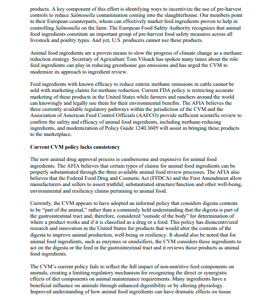 “在各大洲和动物管理系统中,动物饲料正在通过提升动物福利、促进环境保护而留下自己的印记,”Louise Calderwood写道。“不幸的是,长期以来一直被认为是采用创新畜牧业实践的领导者的农民和牧场主,由于CVM在审查新的动物食品时对”食品“与”药物“的狭隘定义而受到阻碍......我们希望得到CVM的支持,让农民和牧场主在动物健康和生产力方面应得的全球领导地位,同时减轻食品生产对环境的影响。