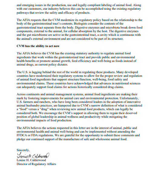 “AFIA认为CVM拥有现有的法定权力来监管在胃肠道内起作用的动物食品成分,并提供公共和环境健康益处,或促进动物生长,饲料效率和福祉,作为食品而不是动物药物,正如目前的政策规定,”Calderwood写道。“AFIA认为,这封信中要求采取的行动符合动物,公共和环境健康以及动物福祉的利益。