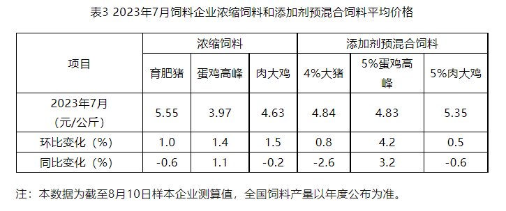 据样本企业数据测算,2023年7月,全国工业饲料产量2713万吨,环比增长3.2%,同比增长7.6%。主要配合饲料、浓缩饲料、添加剂预混合饲料产品出厂价格环比以增为主。饲料企业生产的配合饲料中玉米用量占比为25.2%,同比下降5.6个百分点;配合饲料和浓缩饲料中豆粕用量占比13.1%,同比下降2.8个百分点。
