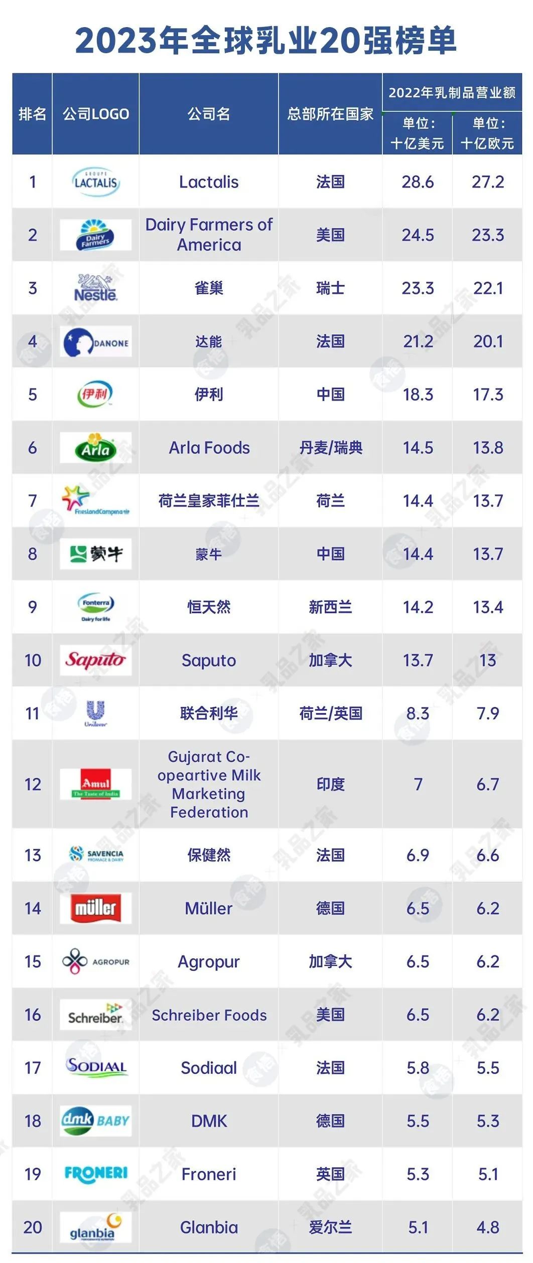 8月29日,荷兰合作银行(Rabobank)公布2023年全球乳业20强。该机构依据乳制品企业2022年业绩发布的全球乳业20强排行榜为目前全球乳业最权威的排行榜单之一。