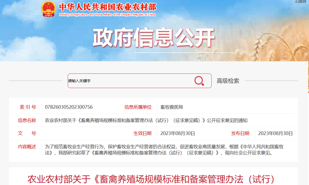 为了规范畜牧业生产经营行为,保护畜牧业生产经营者的合法权益,促进畜牧业高质量发展,根据《中华人民共和国畜牧法》,我部研究起草了《畜禽养殖场规模标准和备案管理办法(试行)(征求意见稿)》,现向社会公开征求意见。公众可以通过以下途径和方式提出意见: