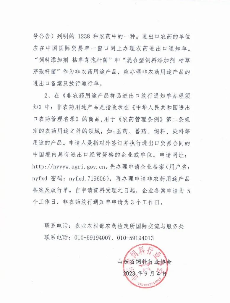 “饲料添加剂枯草芽孢杆菌”产品出口企业办理“非农药用途产品放行通行单”须知