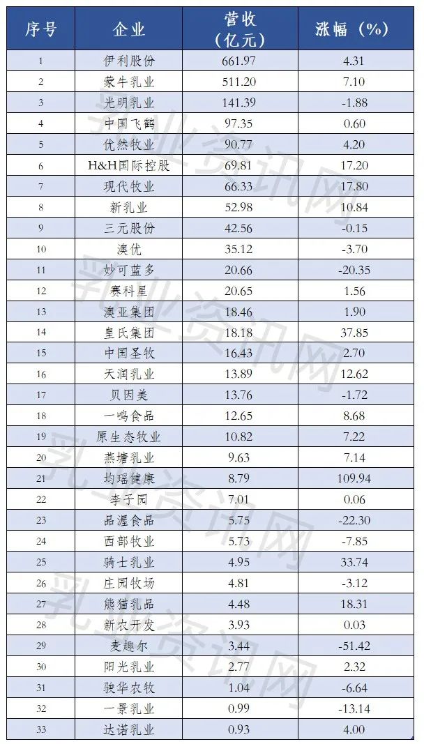 伊利、蒙牛、光明、飞鹤、新乳业等33家上市乳企2023年上半年营收排行榜来了