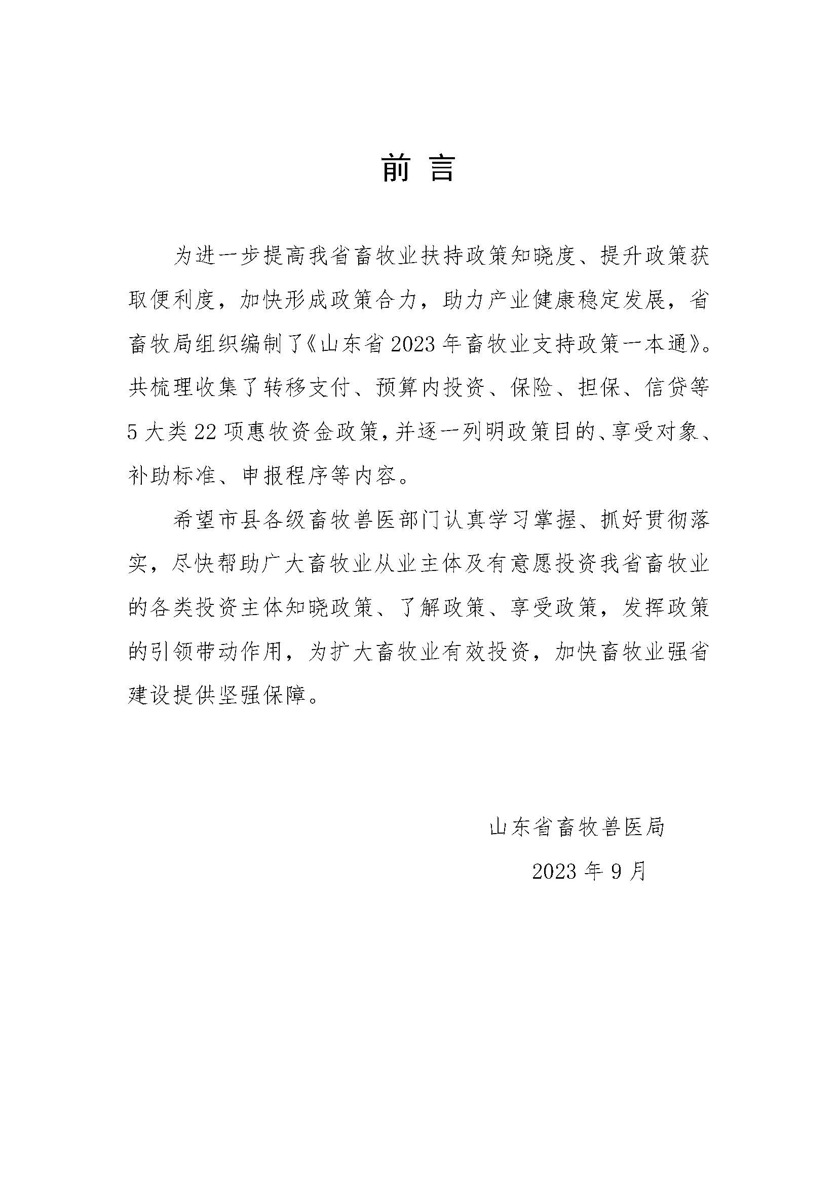 来源:山东省畜牧兽医局 为进一步提高我省畜牧业扶持政策知晓度、提升政策获取便利度,加快形成政策合力,助力产业健康稳定发展,山东省畜牧局组织编制了《山东省2023年畜牧业支持政策一本通》。共梳理收集了转移支付、预算内投资、保险、担保、信贷等5大类22项惠牧资金政策,并逐一列明政策目的、享受对象、补助标准、申报程序等内容。