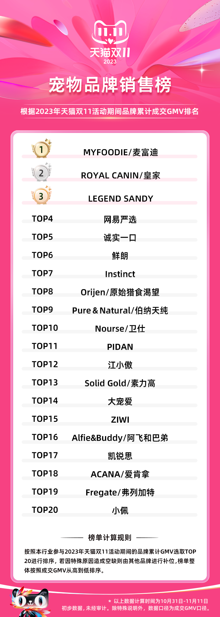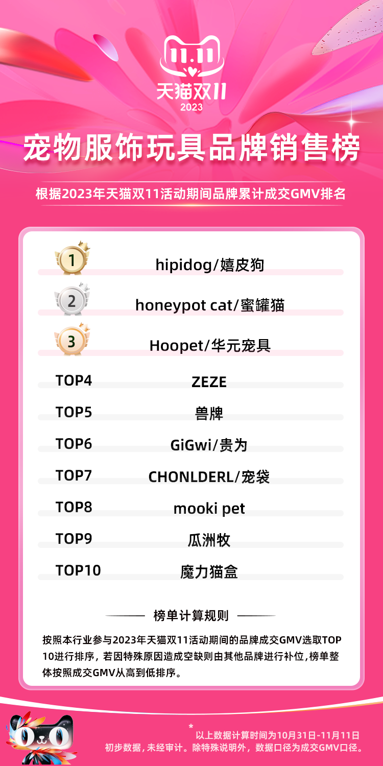 PS:榜单根据2023年天猫双11活动期间品牌累计成交GMV总和排名,统计时间为10月31日-11月11日。