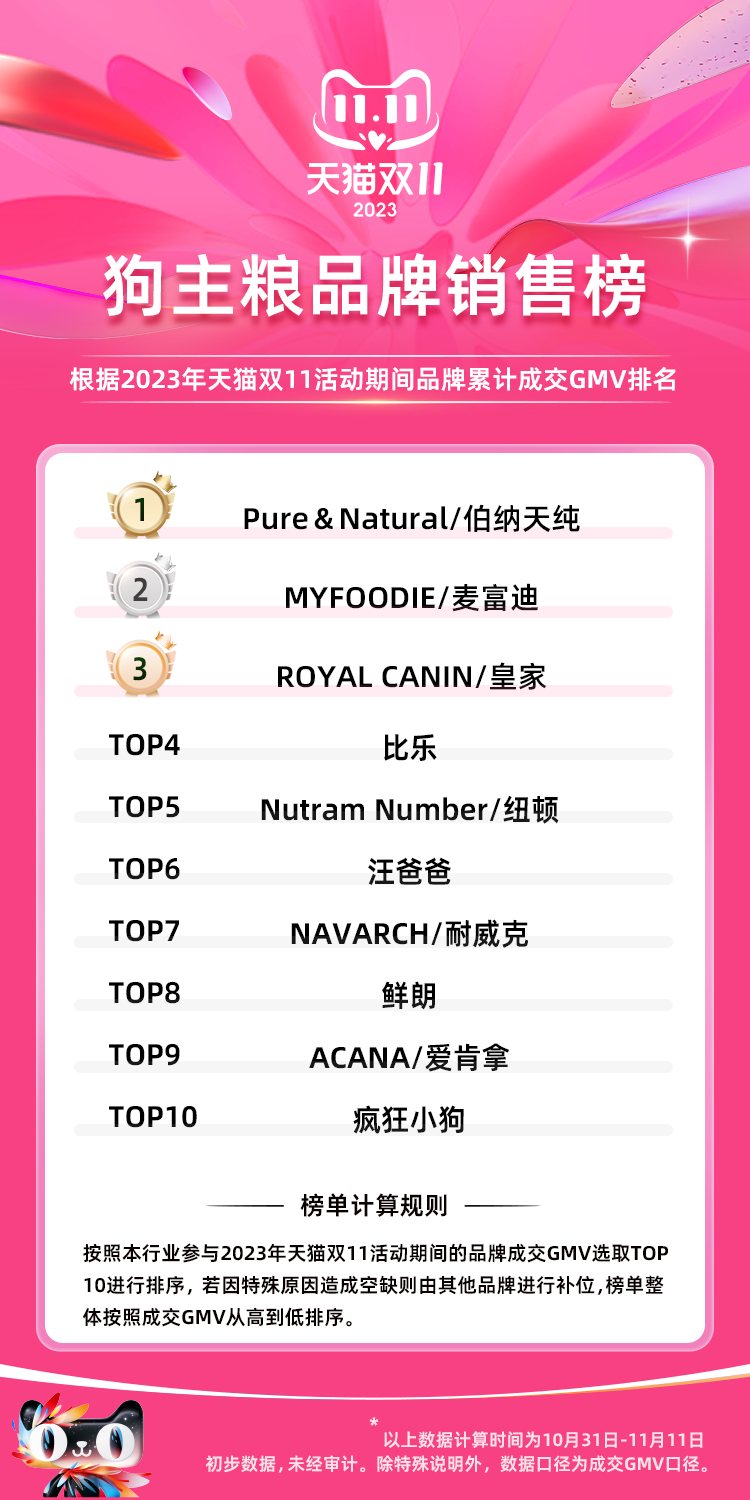 犬主粮品牌销售榜TOP10分别是:伯纳天纯、麦富迪、皇家、比乐、纽顿、汪爸爸、耐威克、鲜朗、爱肯拿、疯狂小狗;