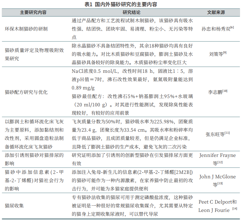 目前,国内对于猫砂的研究主要集中在改良制造工艺切、优化猫砂原料配比、添加有效物质改善特定功能这三个方面。国外对猫砂研究的侧重点略有不同,除研究猫砂性能的提升,更加注重猫砂的延伸功能(表1),这些试验为猫砂的研究探索与应用提供了新思路。