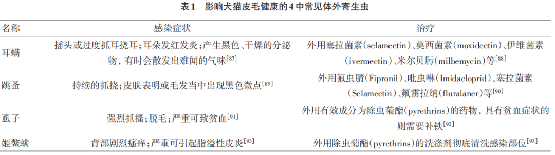 体外寄生虫(表1)感染,是影响宠物皮毛健康的重要因素。在驱除猫犬皮毛病菌及寄生虫的过程中,需要注意以下几点:(1)使用驱虫药品时,需要注意宠物品种和年龄,必须按照说明书上的剂量和使用方法进行操作;(2)驱虫药品需要定期更换,以避免药效降低或产生抗药性;(3)配合养宠环境卫生的管理,以防止寄生虫的滋生和传播。