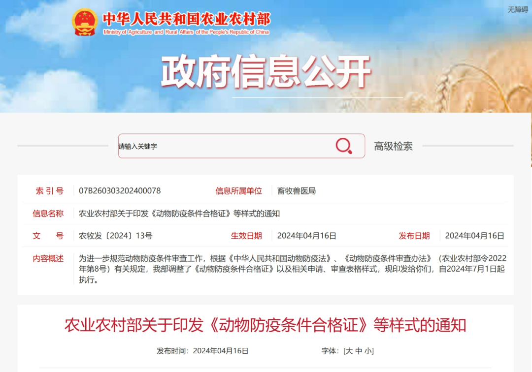 为进一步规范动物防疫条件审查工作,根据《中华人民共和国动物防疫法》、《动物防疫条件审查办法》(农业农村部令2022年第8号)有关规定,农业农村部调整了《动物防疫条件合格证》以及相关申请、审查表格样式,自2024年7月1日起执行。同时《农业部关于印发〈动物防疫条件合格证〉样式及填写规范的通知》(农医发〔2010〕26号)废止。