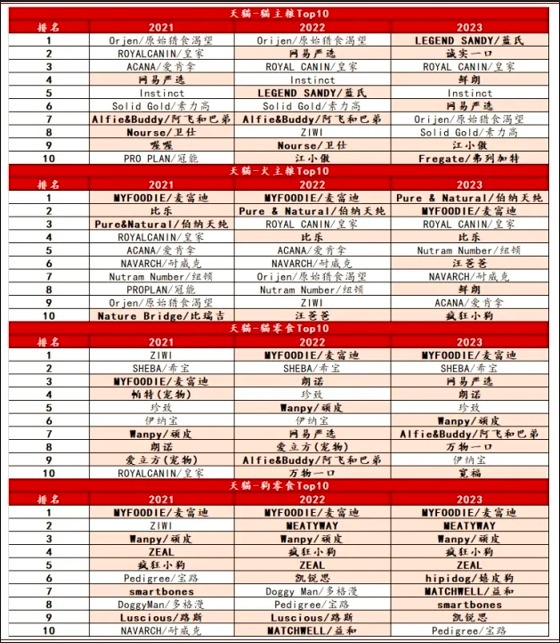 2021-2023年双11宠物全周期品牌榜(天猫、京东、抖音)