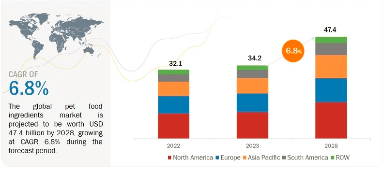 根据MarketsandMarkets最新报告显示,全球宠物食品配料市场2023年达到342亿美元,预计2028年将达到474亿美元,预测期内的复合年增长率为6.8%。宠物主愿意为含有创新成分和优质宠物食品花费更多,这种高端化趋势将促使生产商探索更多宠物食品创新配方。