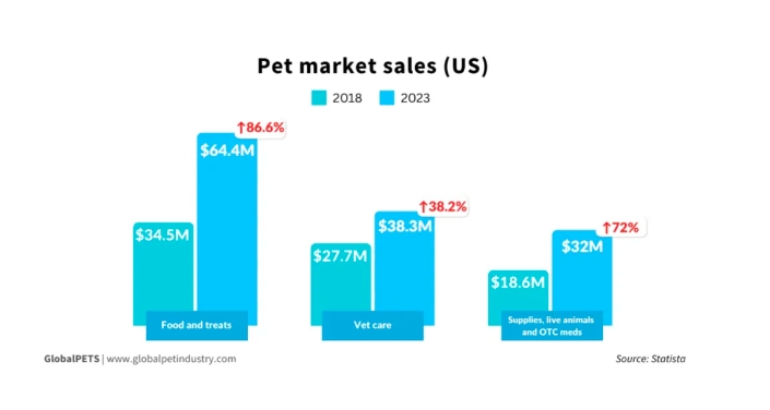 2023年,美国宠物食品和零食销售额达到了644亿美元,比2022年同比增长了10.8%。据Statista数据报道,该类别当年的销售额为581亿美元。
