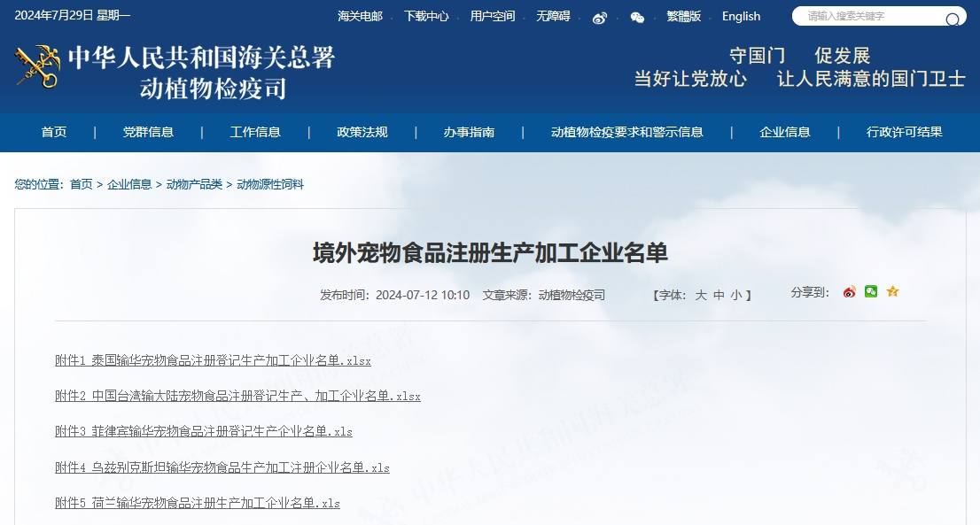目前,已有泰国、中国台湾、菲律宾、吉尔吉斯坦、乌兹别克斯坦、荷兰、法国、比利时、德国、丹麦、西班牙、捷克、意大利、奥地利、美国、加拿大、巴西、阿根廷、新西兰、澳大利亚、波兰等国家或地区的宠物食品获得准入。