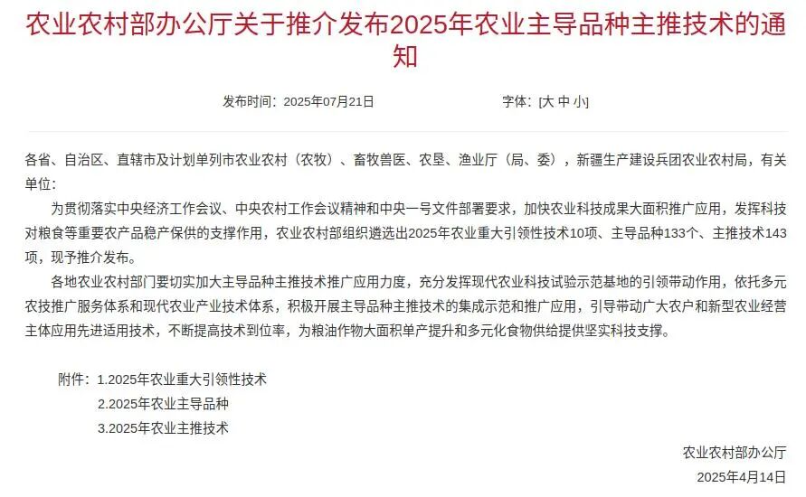 2025年4月,农业农村部推介发布2025年农业主导品种和主推技术。由全国畜牧总站、北京大北农科技集团股份有限公司联合畜牧饲料领域多家单位协同创制的“饲料粮节约与多元化替代技术”,成功入选2025年十大农业重大引领性技术。
